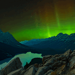 From the rocky heights above Peyto Lake, the sky awakens in silent dance. Green and red auroras ripple across the night, casting a spectral glow over ...[+]