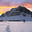 At the snowy edge of Bow Lake, a lone figure in a red jacket sits quietly on the dock, her footprints the only marks in a pristine winter canvas. Before her, the north face of Crowfoot Mountain rises in silent majesty, its rugged slopes dusted in snow. Above, the sky glows with the fading fire of sunset—clouds lit in soft pinks and burning oranges, casting a gentle warmth over the frozen world. This is a moment of stillness and scale, where solitude meets wonder beneath the winter sky.