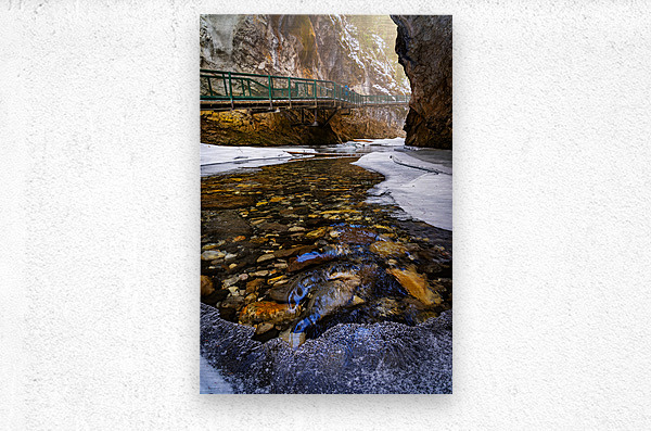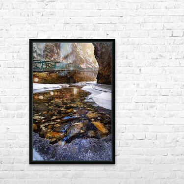 At Johnston Canyon, the green catwalk clings to icy cliffs, guiding the way through a frozen world in transition. Snow and ice still coat the canyon’s walls and edges, but the heart of the stream runs clear, revealing the colorful stones beneath its surface. A beam of sunlight breaks through the narrow gap above, spilling warm light onto the snow-covered rock and bringing life to the shadows. This is a moment between seasons—where the stillness of winter begins to melt into the song of spring.