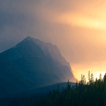 Boom Mountain looms on the left, veiled in rain and shadow, its layered slopes blurred beneath heavy dark clouds. The weight of the storm gathers above, brooding and immense. Yet to the right, the scene transforms—sunset pierces the rain, igniting the sky in brilliant orange hues. Below, a dense green forest soaks in the light, vivid and alive against the fading storm. This photograph captures nature in tension and balance—a landscape divided by weather, yet united by the beauty of change.