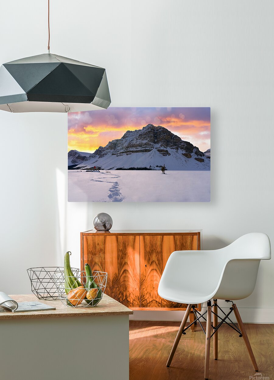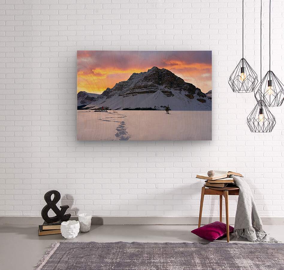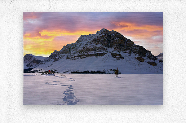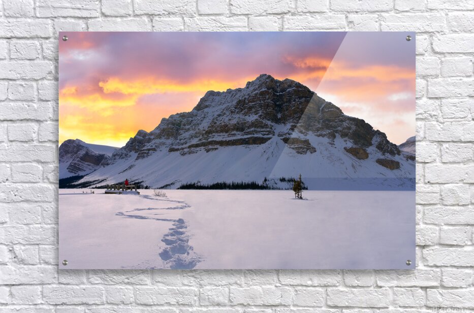 At the snowy edge of Bow Lake, a lone figure in a red jacket sits quietly on the dock, her footprints the only marks in a pristine winter canvas. Before her, the north face of Crowfoot Mountain rises in silent majesty, its rugged slopes dusted in snow. Above, the sky glows with the fading fire of sunset—clouds lit in soft pinks and burning oranges, casting a gentle warmth over the frozen world. This is a moment of stillness and scale, where solitude meets wonder beneath the winter sky.