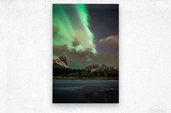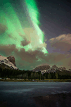 Beneath the stillness of a frozen Quarry Lake, Ha Ling Peak and Mount Rundle rises like two sentinels under a vast winter sky. A brilliant green band of northern light slices the night in two, casting an eerie glow across the mountains’ snowy flanks. Above them, a row of dark clouds hovers low, heavy with silence. This is a moment of contrast and awe—where the earth sleeps, and the sky stirs with ancient light.