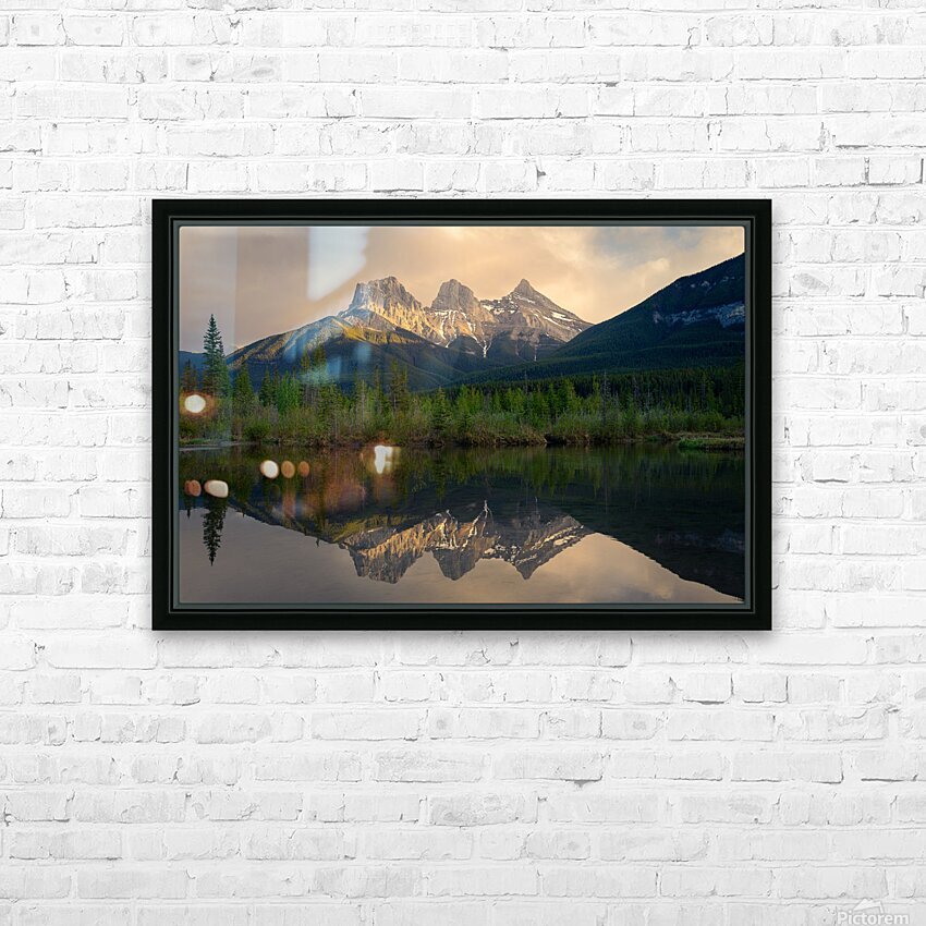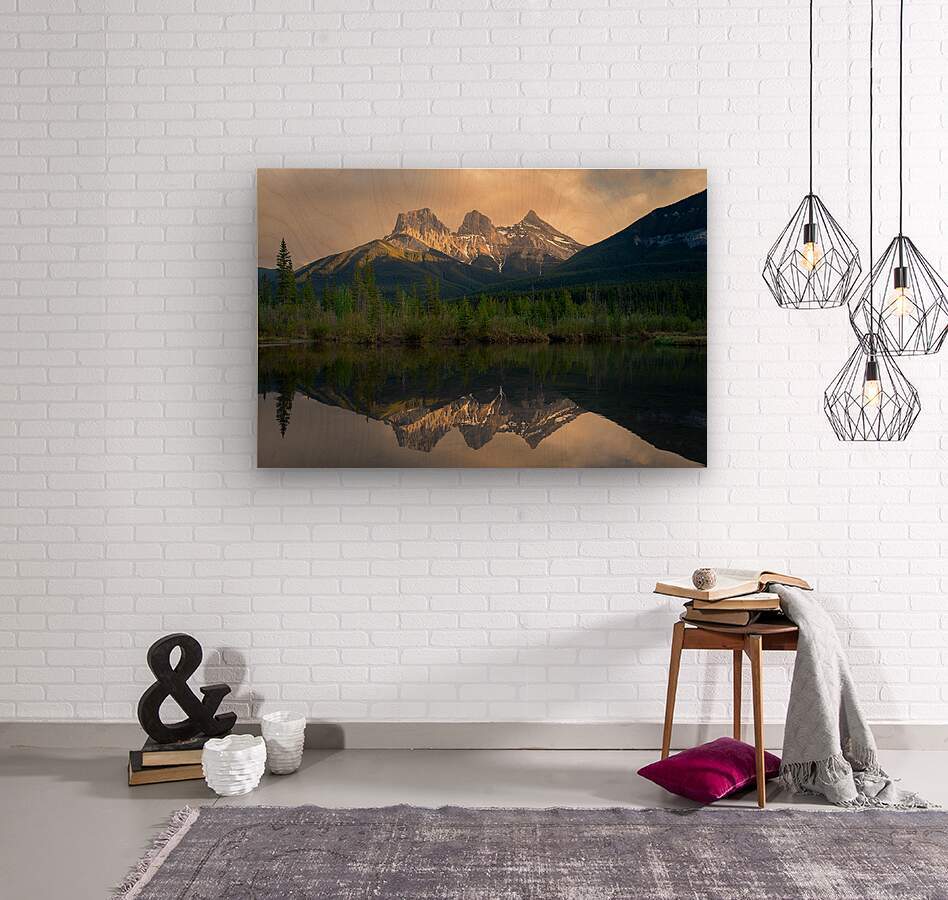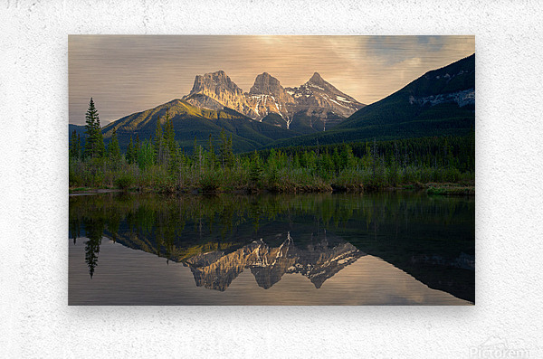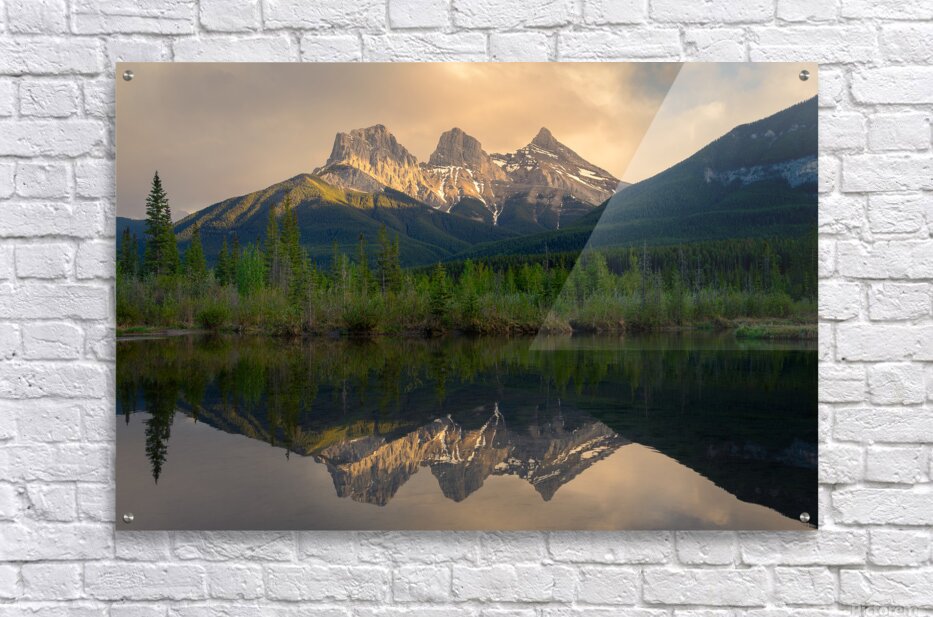 The iconic peaks of the Three Sisters rise beneath a brooding sky, their rugged silhouettes softened by the golden brush of sunset light. Below, a still pool of dead water mirrors the scene with haunting perfection—clouds, mountains, and light suspended in quiet symmetry. This photograph captures a fleeting moment where drama meets calm, and the wild beauty of the Rockies stands both grounded and ethereal.